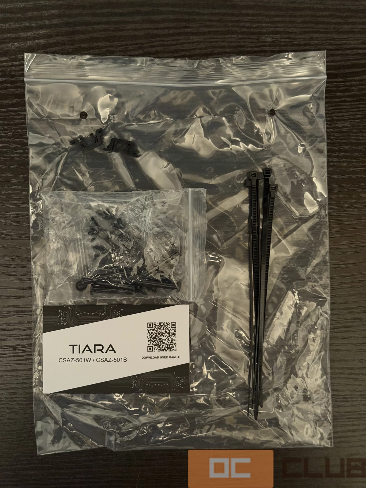 Комплектация без излишеств: набор винтов, несколько пластиковых стяжек и визитка AZZA с названием линейки корпуса. В качестве небольшого бонуса положили пару запасных клипс.