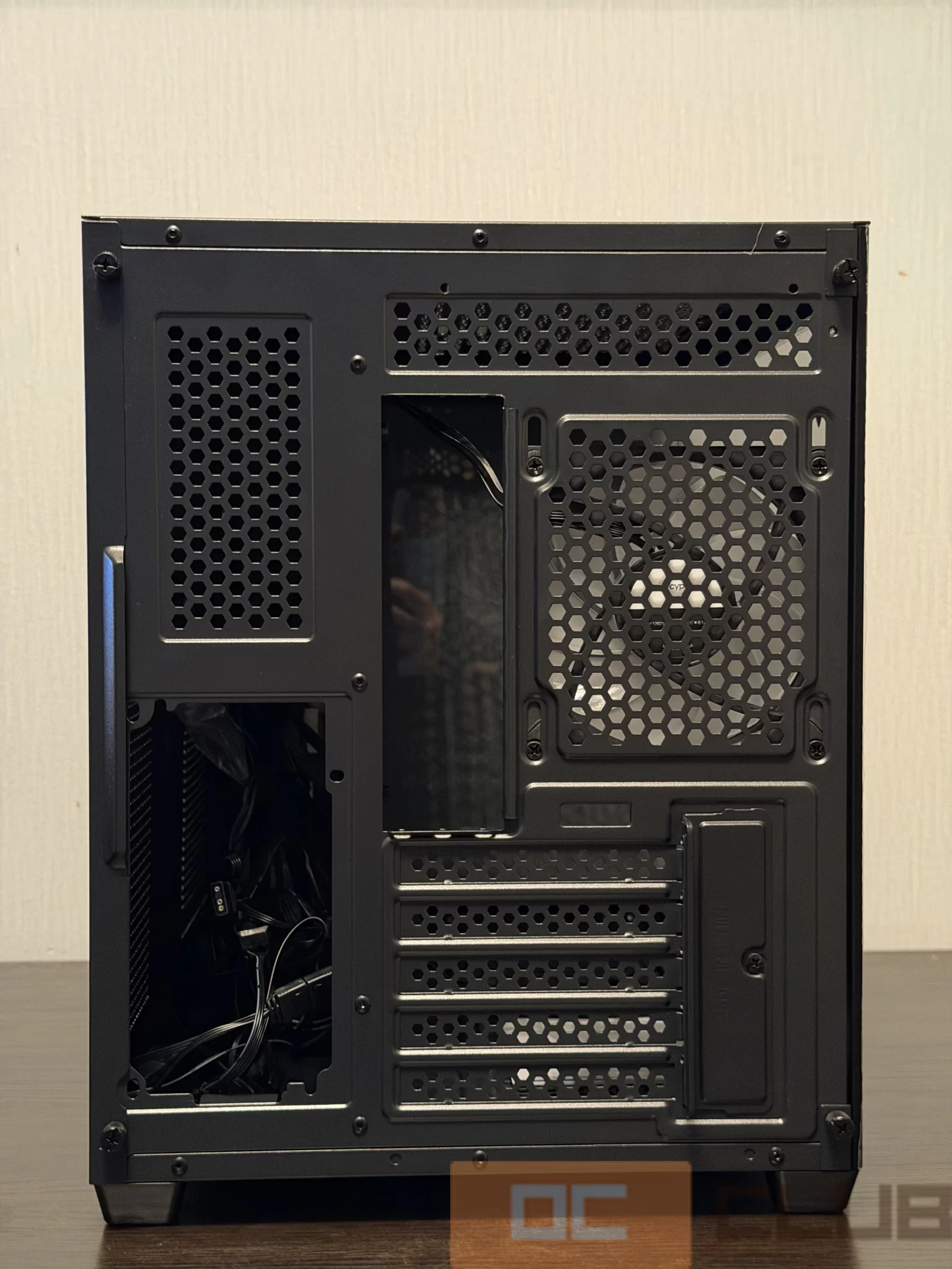 С тыльной стороны корпус выглядит достойно. Здесь предусмотрены крупные прорези для укладки кабелей и достаточно свободного пространства. Отсеки для SATA-накопителей съёмные, поэтому при необходимости внутренний объём можно увеличить.