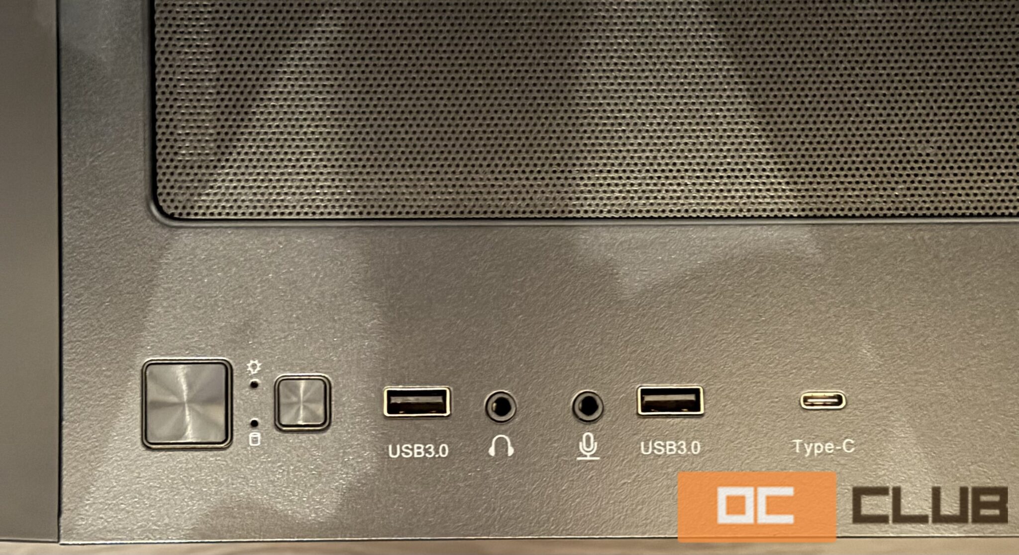 Порты ввода-вывода расположены сверху. Набор разъёмов удачный: современный USB Type-C, два USB 3.2 и раздельные 3,5-мм аудиоразъёмы. Многие производители отказываются от двух USB на фронтальной панели, но здесь Ocypus пошла правильным путём. Кнопка перезагрузки также на месте, что сейчас встречается всё реже.
