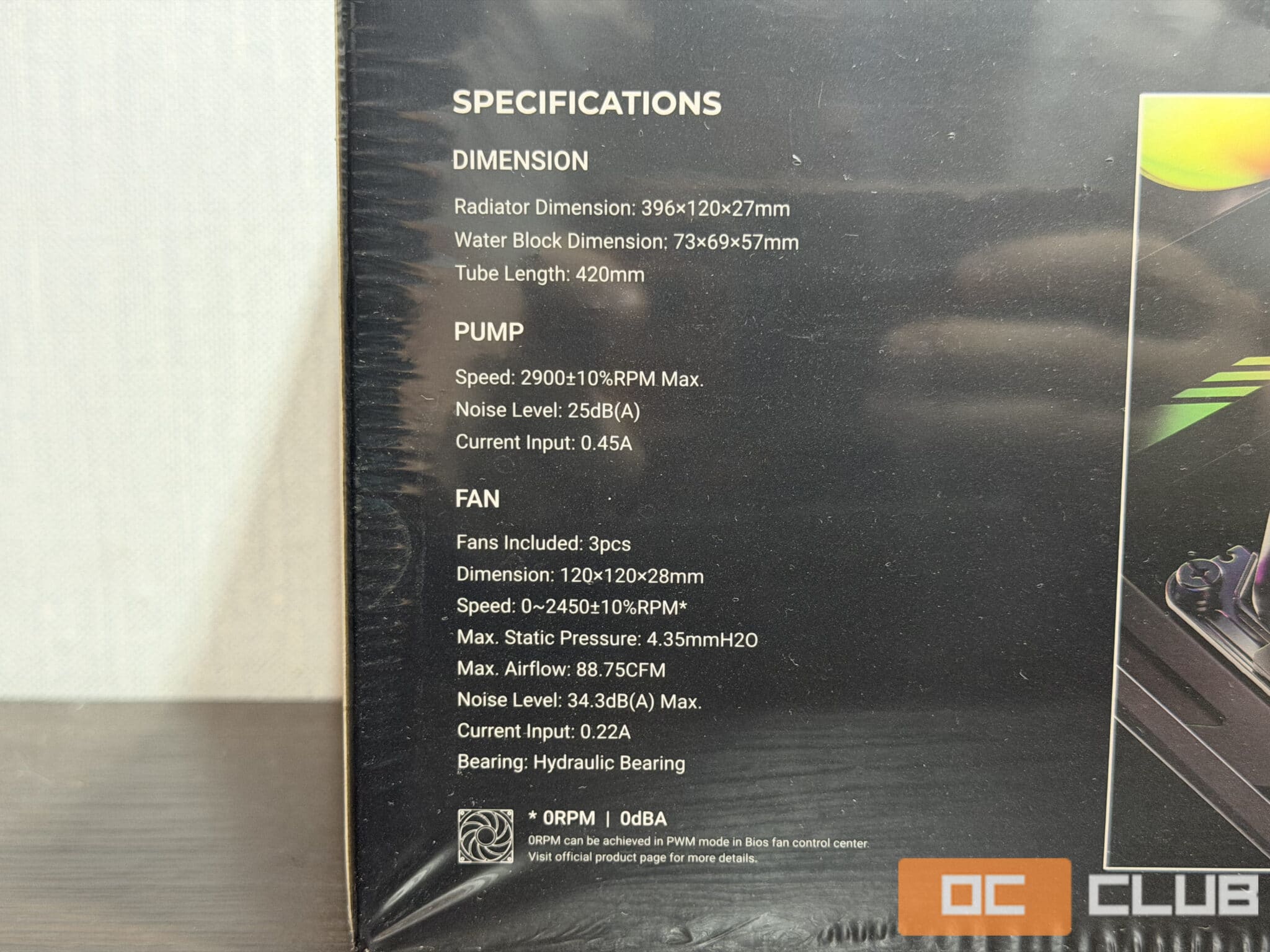 Задняя сторона отведена под технические характеристик. TDP нам к сожалению не обозначали, скорость вращения вентиляторов и совместимые сокеты. Точные размеры радиатора им помпы. Упомянули и то что вентиляторы с фанстопом.